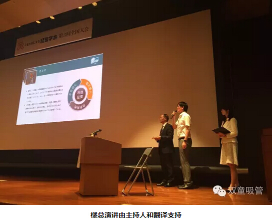 本次樓總的演講主題是《“雙童”人本經(jīng)營實踐--不忘初心、敬天愛人》,樓總采用中文演講+日文PPT播放,再由會議主辦方進行日文同聲翻譯。因為語言溝通的原因樓總無法在演講中做到幽默和風趣,但分享過程中對“雙童”人本經(jīng)營的精彩呈現(xiàn)深深地吸引了與會代表的大量拍照,并在演講過程和結束后獲得了幾分鐘的持續(xù)掌聲。