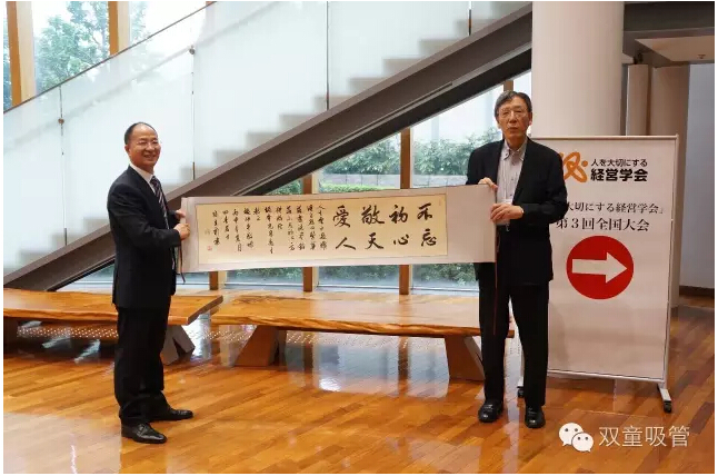 在啟程前就事先懇請義烏著名的書法家貝立新老師將本次演講主題的《不忘初心、敬天愛人》做成書法作品,作為禮品帶到日本,并在活動結束后敬獻給坂本光司老師以致感謝。書法的落款附句是“人生云水過,難得自然心,繁花落盡,洗盡鉛華,不忘初心,方得始終?!睒强倢⒀葜v內(nèi)容的主題與致謝禮品融為一體,足以說明樓總在為人處世和做事細節(jié)上的極致追求。