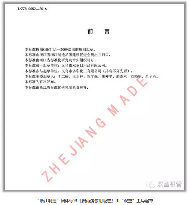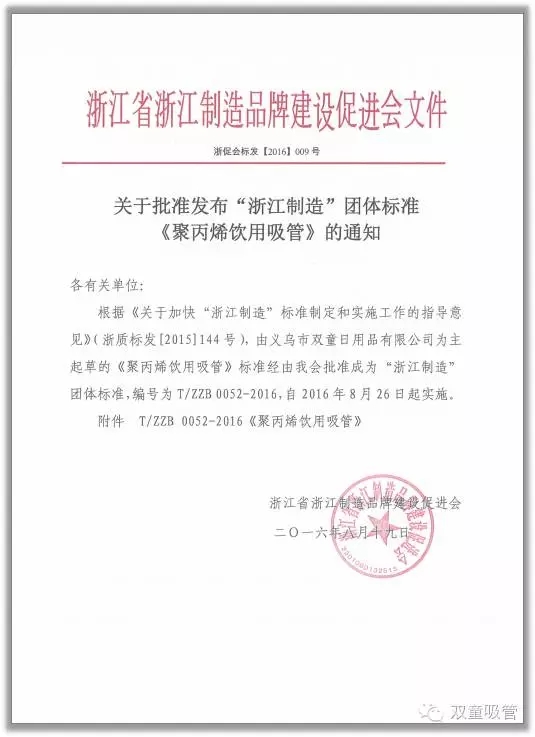 8月26日,“雙童”收到了浙江省浙江制造品牌建設(shè)促進(jìn)會(huì)發(fā)出的通知,正式通知由“雙童”為主起草的“浙江制造”團(tuán)體標(biāo)準(zhǔn)《聚丙烯飲用吸管》正式發(fā)布實(shí)施!