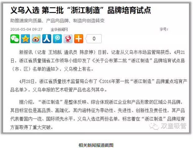 在2014年年底,浙江在全國率先以標(biāo)準(zhǔn)和認(rèn)證為手段打造首個(gè)區(qū)域性公共品牌——“浙江制造”品牌。“浙江制造”標(biāo)準(zhǔn)比國家及行業(yè)標(biāo)準(zhǔn)要求要高,基本達(dá)到國際先進(jìn)、國內(nèi)一流水平。4月28日,浙江省質(zhì)量技術(shù)監(jiān)督局公布《2016年第一批“浙江制造”品牌重點(diǎn)培育產(chǎn)品名單》,我們“雙童”代表義烏申報(bào)的吸管產(chǎn)品名列其中。入選這份名單,標(biāo)志著義烏在“浙江制造”品牌培育方面取得了重大突破。