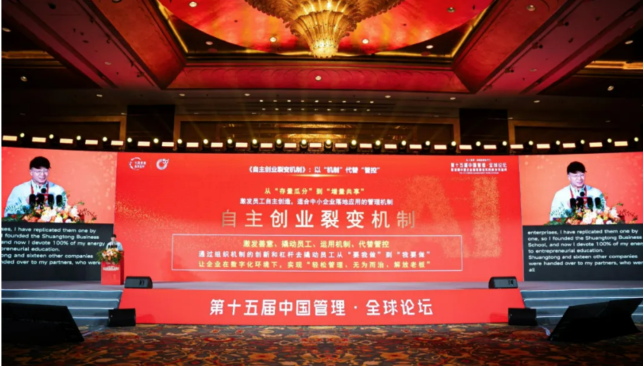 雙童創(chuàng)始人樓仲平作為獲獎(jiǎng)企業(yè)代表,在論壇現(xiàn)場(chǎng)作了題為《機(jī)制創(chuàng)新與“共同富?!钡碾p童實(shí)踐》的專題分享。希望雙童的“自主創(chuàng)業(yè)裂變機(jī)制”能助力更多企業(yè)轉(zhuǎn)型升級(jí),為全球管理實(shí)踐注入新的活力!接下來(lái),就讓我們一起走入分享現(xiàn)場(chǎng)吧!