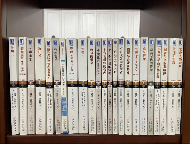 樓仲平書架上擺滿了德魯克的書