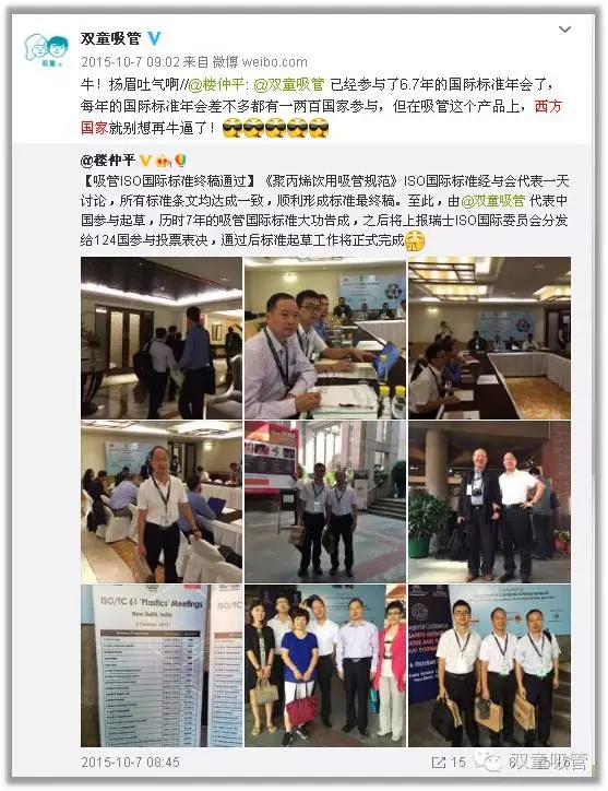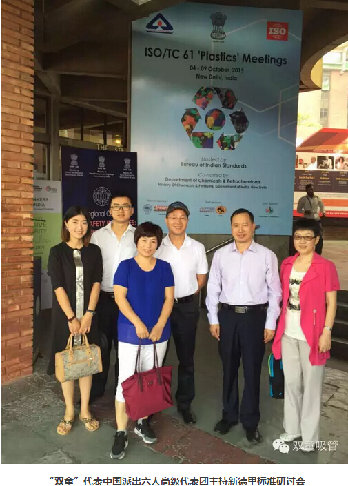 2015年10月6日,ISO TC61國際標準化組織年會在印度新德里召開,作為最后一次國際標準起草工作的定稿工作,“雙童”代表中國派出了強大的六人技術(shù)代表團。經(jīng)過幾天緊張的討論,“雙童”會同各參與主席國對《聚丙烯飲用吸管規(guī)范》送審稿的各項條文進行最終的程序性確認,在參與各國代表一致同意下形成了《聚丙烯飲用吸管規(guī)范》ISO國際標準報批稿,提交給瑞士日內(nèi)瓦的ISO國際標準化組織最終審定。