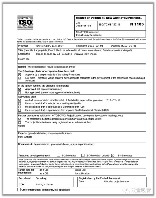 ISO國際標準化組織下發(fā)的《聚丙烯飲用吸管規(guī)范》標準任務(wù)書