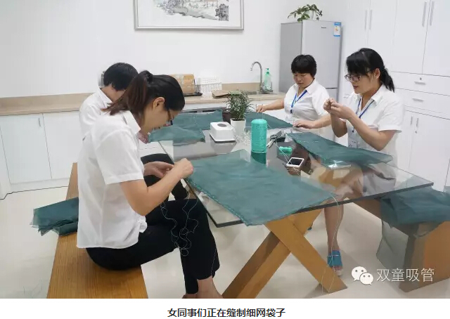 為此,我們的辦公室還發(fā)掘出了一批“繡娘”呢!辦公室的女同胞們?cè)谖苕さ慕M織下,全都手工縫制起了用于裝置活性炭的細(xì)網(wǎng)袋子!2016年最新款“雙童”手工袋,全球限量發(fā)行,你值得擁有!