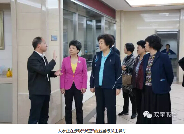 參觀結(jié)束之后,領(lǐng)導(dǎo)們也說了一定要去看看“雙童”著名的五星級員工餐廳!當(dāng)家人樓總介紹到:“餐廳內(nèi)的設(shè)施都配備了最好的硬件,就拿桌子來說,員工餐廳的每一張桌子重達(dá)四五百斤,是木中之王的柚木定制而成,每一張就要15000元。另外員工的餐飲都是三菜一湯的標(biāo)配,員工們使用后的所有碗筷都由食堂阿姨進(jìn)行清洗和消毒,同時鼓勵員工的家人也一起在餐廳就餐。”