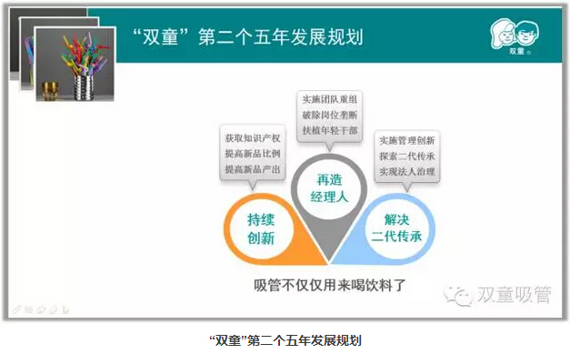 2011年9月,“雙童”又提出了第二個(gè)五年發(fā)展規(guī)劃,其中提出了三個(gè)關(guān)鍵詞“持續(xù)創(chuàng)新”、“再造經(jīng)理人”、“解決二代傳承”。這些戰(zhàn)略規(guī)劃讓“雙童”的品牌影響力持續(xù)擴(kuò)大、行業(yè)地位得到持續(xù)提升、成為了綠色環(huán)保的制造業(yè)標(biāo)桿、社會(huì)美譽(yù)度和知名度持續(xù)提升,最終形成了鮮明特色的“雙童”文化。