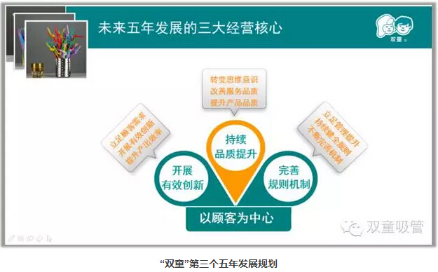 通過(guò)十多年的持續(xù)提升,“雙童”已然比較優(yōu)秀,但從60分—80分相對(duì)容易,從80分到95分就更加不易。我們需要從80分向95分突破和進(jìn)步,所以第三個(gè)五年發(fā)展規(guī)劃以顧客為中心,腳踏實(shí)地的經(jīng)營(yíng)好企業(yè)。未來(lái)五年發(fā)展規(guī)劃的三大核心為:“持續(xù)品質(zhì)提升”、“開展有效創(chuàng)新”、“完善規(guī)則機(jī)制”。