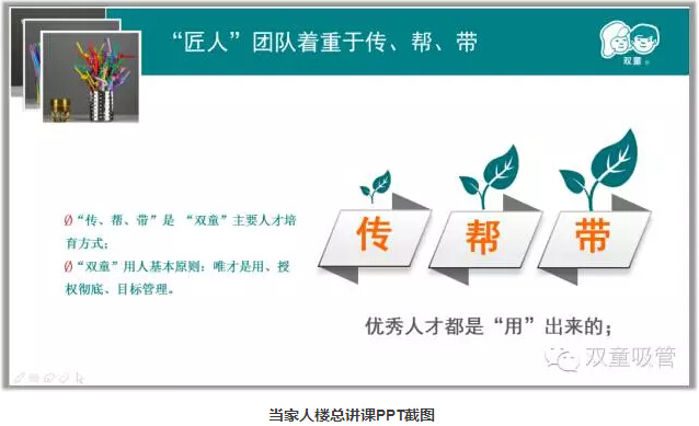 俗話說:“團隊好企業(yè)才能好”,“雙童”培養(yǎng)經(jīng)理人團隊成為“匠人”的方式就是“傳、幫、帶”!當(dāng)初,當(dāng)家人樓總把總經(jīng)理李二橋和吸管妞帶著身邊培養(yǎng),左邊坐著吸管妞右邊坐著總經(jīng)理李二橋,通過一起工作影響身邊的人!