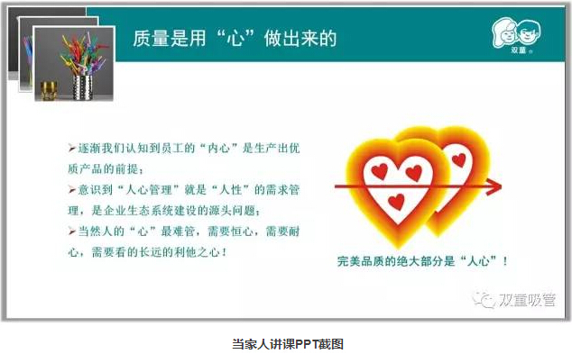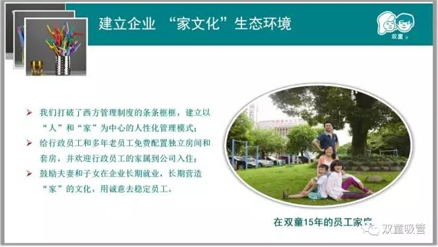第二章,當家人樓總從自身擴大到“雙童”團隊,談到“雙童”不斷地進行硬件改革,給員工提供最好的工作和生活環(huán)境,致力于建立“家文化”,鼓勵夫妻和子女在企業(yè)就業(yè),解決核心員工家庭生活問題,長期營造“家”的文化,用誠意去穩(wěn)定員工!