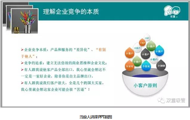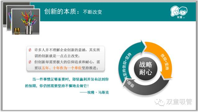 其實真正把自己的產(chǎn)品做好了,企業(yè)在一定時候擴大規(guī)模才是自然而至的,因此不要一畏地想著大,適當做減法,寧可盈利不作大,不可做大不盈利!“雙童”的發(fā)展始終伴隨著不斷的放棄,在自己的領域里細分細分再細分,把一根吸管做到極致!