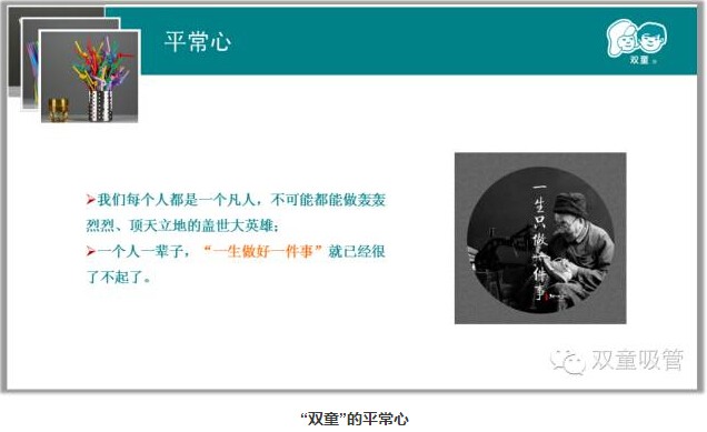 這家一次性筷子工廠和日本企業(yè)的綠色環(huán)保經(jīng)營(yíng)模式一直影響了我對(duì)企業(yè)和產(chǎn)品的經(jīng)營(yíng)思維,認(rèn)知到通過堅(jiān)持和創(chuàng)新完全可以改變企業(yè)的不變真理,從而影響了“雙童”在后續(xù)發(fā)展過程中始終堅(jiān)守在“一根吸管”上,并通過專注不輟、精進(jìn)創(chuàng)新、用心經(jīng)營(yíng)而形成了獨(dú)具特色的“雙童工匠思維”,使“雙童”逐漸擺脫了薄利多銷的粗放經(jīng)營(yíng),逐步形成了精細(xì)化管理、生態(tài)環(huán)保、與員工共成長(zhǎng)的可持續(xù)發(fā)展道路,從而徹底改變了世人對(duì)吸管行業(yè)的低、小、散、弱的傳統(tǒng)認(rèn)知。下面我就“雙童”二十多年逐漸形成的“匠人思維”做一個(gè)簡(jiǎn)單的總結(jié)和回顧: