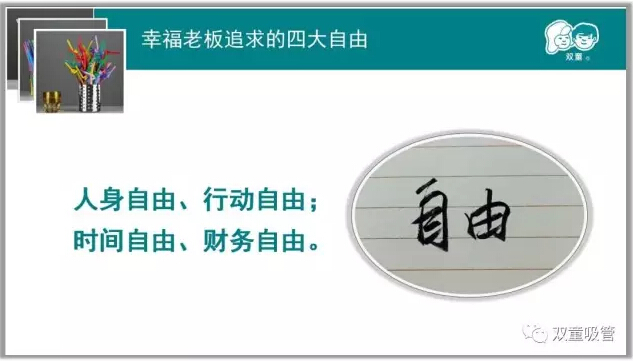 而對于企業(yè)主來說,除了做到之前幾點之外,還要做到清晰認知自己的企業(yè)需要什么,拒絕什么,學會獨處和堅守,在有限的時間做重要的事!同時在中國的大環(huán)境下,老板們要謹慎追求所謂的言論自由和人權自由。唯有這樣,老板自由,員工自由,企業(yè)也就相對自由!