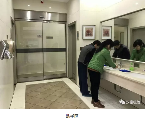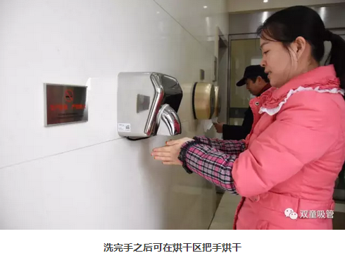 在洗手區(qū),俯身洗手時,你會看見墻面上溫馨的提示語:“洗手臺盆,保持清潔;請勿將大量的水濺出臺盆濺濕地面”。洗完手之后,員工可以在烘干區(qū)把手烘干。