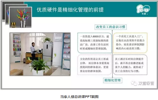 當(dāng)家人樓總常說廁所應(yīng)該是一個企業(yè)最干凈的地方,連廁所都打掃不干凈的企業(yè),怎么可能生產(chǎn)出讓人放心的產(chǎn)品!環(huán)境會潛移默化地影響員工的素養(yǎng),環(huán)境不好則會產(chǎn)生破窗效應(yīng)。一個組織內(nèi)部,如果有了一些垃圾沒有及時清理,就會有更多的垃圾。個體習(xí)慣依附于“群體意識”,“群體意識”決定了你會養(yǎng)成什么樣的習(xí)慣,員工的習(xí)慣影響著員工會做出怎樣的產(chǎn)品,因此優(yōu)質(zhì)硬件是精細(xì)化管理的前提,同時意識引導(dǎo)也至關(guān)重要!
