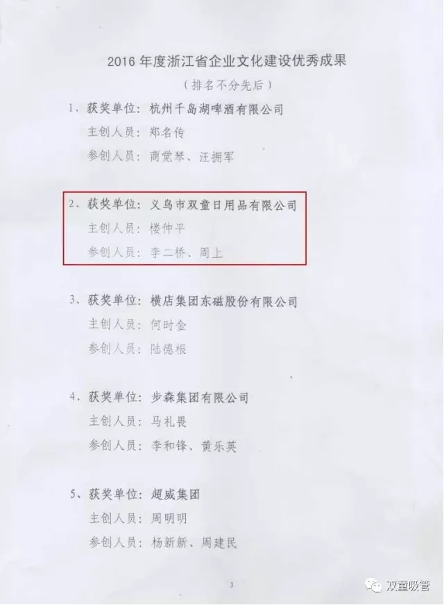 今年上半年,浙江省企業(yè)聯(lián)合會進(jìn)行了2016年度浙江省企業(yè)文化建設(shè)優(yōu)秀成果的評選活動。這不,最近傳來了好消息,這次一共有五家企業(yè)獲得此項(xiàng)殊榮,“雙童”作為義烏唯一一家獲獎企業(yè)也名列其中呢!大家是不是很好奇“雙童”是如何建設(shè)企業(yè)文化的呢?下面吸管妞就帶大家來一看究竟吧!
