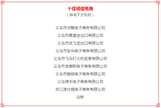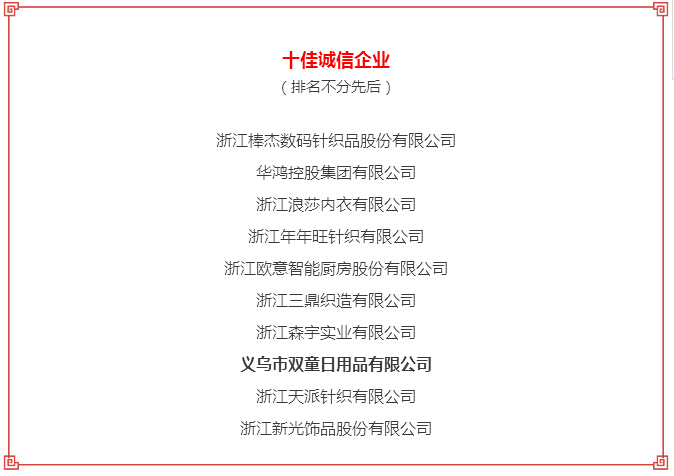 1月9日上午,義烏市2017年“誠信日”暨“義烏中國小商品城”品牌授權(quán)儀式在幸福湖隆重舉行!為褒揚(yáng)守信主體、營造誠信氛圍,當(dāng)天還舉行了首屆守信“紅名單”發(fā)布儀式,為“十佳誠信企業(yè)”、“十佳誠信外商”、“十佳誠信電商”和“十佳誠信經(jīng)營戶”授牌。“雙童”也名列其中,成為“十佳誠信企業(yè)”之一!