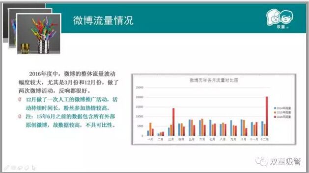 過(guò)去一年,“雙童”微信和微博堅(jiān)持每個(gè)工作日更新原創(chuàng),并開(kāi)展了40次員工活動(dòng),22次宣傳欄等工作!2017年,除了做好原有工作之外,我們將結(jié)合公司第三個(gè)五年發(fā)展規(guī)劃,深入基層,影響員工的思維意識(shí),持續(xù)品質(zhì)提升!
