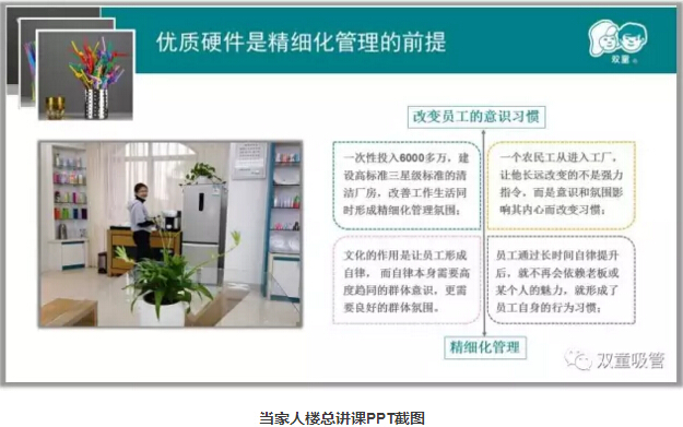 優(yōu)質(zhì)硬件是精細(xì)化管理的前提,更是提升產(chǎn)品品質(zhì)的前提,它不僅能潛移默化地影響員工的素養(yǎng),更能提高員工的質(zhì)量意識!所以好的環(huán)境決定了員工會做出怎樣的產(chǎn)品!唯有一流的硬件環(huán)境,才能生產(chǎn)出世界一流的完美產(chǎn)品!看到這里,大家應(yīng)該明白“雙童”為何能做好一根小吸管了吧!