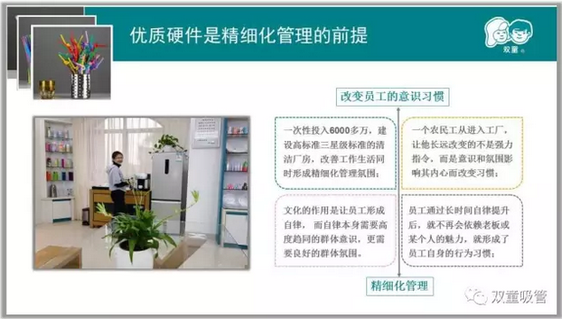 “雙童”給員工用五星級(jí)的硬件,也是引導(dǎo)員工改變自身的思維和行為方式,讓員工關(guān)注細(xì)節(jié)!質(zhì)量是用“心”做出來的,通過這樣的氛圍影響員工的內(nèi)心,員工的素質(zhì)和質(zhì)量意識(shí)才能進(jìn)一步提升!因此優(yōu)質(zhì)硬件是生產(chǎn)優(yōu)質(zhì)產(chǎn)品的必要前提,有高品質(zhì)的硬件為基礎(chǔ),員工才能用“心”做出更好產(chǎn)品,我們的產(chǎn)品才能更加精致完美!