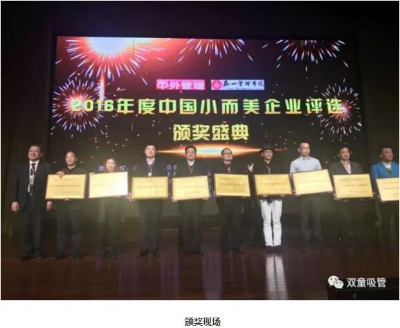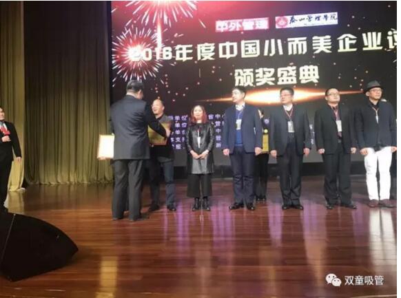 2月26日下午,當家人樓總和二當家李總受邀前往《中外管理》雜志社與泰山管理學院聯(lián)合舉辦的2016年度中國小而美企業(yè)頒獎盛典。此次評選有全國各地56家隱形冠軍企業(yè)的參選申請,經(jīng)過專家評審委員會的評選,共有11家企業(yè)脫穎而出,榮獲“2016年度中國小而美企業(yè)”,“雙童”也名列其中!