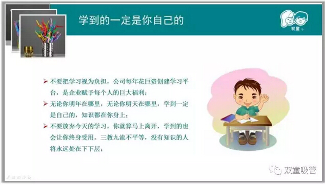 學(xué)歷≠知識(shí)、才人≠人才,學(xué)習(xí)并不是學(xué)校里才需要做的事!如果工作以后就不思進(jìn)取,不學(xué)習(xí)提升,就算是博士生,“雙童”也不會(huì)對(duì)你敞開大門!而對(duì)于那些肯學(xué)習(xí)、肯鉆研的員工,“雙童”會(huì)提供非常多的學(xué)習(xí)機(jī)會(huì)和提升空間,讓你在“雙童”有一個(gè)更好的發(fā)展!就算有一天你離開了“雙童”,你學(xué)到的始終是你自己的!