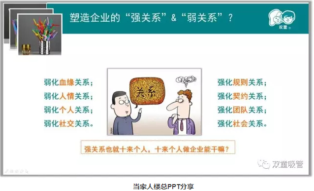 當家人樓總十分注重關系哲學,畢竟一個人的能力是有限的,他能發(fā)展的強關系范圍也就只有十來個人,在企業(yè)經(jīng)營中,十多個人的作用并不大!在企業(yè)內部要弱化血緣關系,強化規(guī)則關系;弱化人情關系,強化契約關系;弱化個人關系,強化團隊關系;弱化社交關系,強化社會關系。