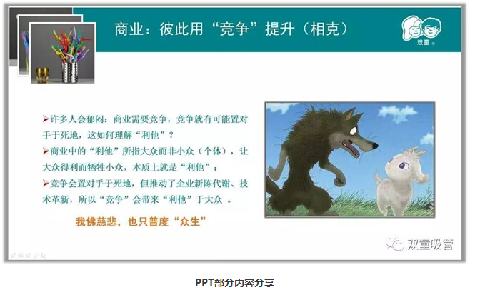 商業(yè)除了“利他”之外,還要通過競(jìng)爭(zhēng)彼此提升。商業(yè)中的“利他”所指大眾而非小眾,讓大眾得利而犧牲小眾,本質(zhì)上就是“利他”;競(jìng)爭(zhēng)會(huì)置對(duì)手于死地,但推動(dòng)了企業(yè)新陳代謝、技術(shù)革新,所以“競(jìng)爭(zhēng)”會(huì)帶來“利他”于大眾 ,最終達(dá)到“無我”而“有我”,放下“自我”而成全“自我”!