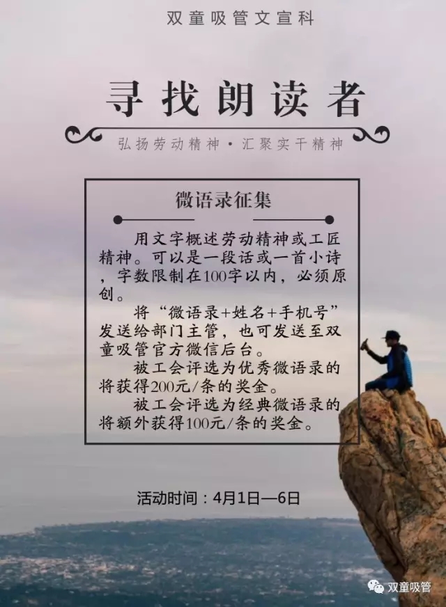 前段時(shí)間,義烏市總工會(huì)舉辦了“弘揚(yáng)勞動(dòng)精神·匯聚實(shí)干力量”尋找朗讀者活動(dòng),征集以勞動(dòng)精神、勞模精神或工匠精神為主題的微語(yǔ)錄。吸管妞一看到此次活動(dòng),就覺(jué)得這樣的活動(dòng)太適合“雙童”人啦,立馬就報(bào)名啦!