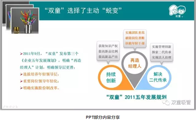 2.雙童”主動選擇蛻變,發(fā)布了《企業(yè)五年發(fā)展規(guī)劃》,明確“再造經(jīng)理人”計劃,明確領(lǐng)導層更替。