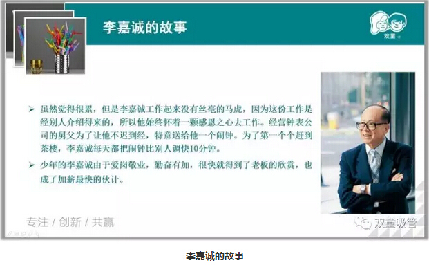 我們都應(yīng)該心懷感恩之心,用感恩的心去工作。妞也用李嘉誠的案例故事和童鞋們進(jìn)行分享:“李嘉誠在茶樓當(dāng)伙計(jì)時(shí),每天天未亮就出去工作,盡管每天工作時(shí)間長達(dá)15小時(shí),也不會(huì)絲毫的懈怠馬虎,始終懷著一顆感恩之心去工作。在隨后的創(chuàng)業(yè)過程中,懷著感恩之心開創(chuàng)了屬于自己的事業(yè),成為華人首富。”李嘉誠的事例說明,感恩和敬業(yè)可以最大程度的激發(fā)一個(gè)人的潛能,使之迅速在職場中脫穎而出,無論你從事什么工作,都要牢記,用心者事競成!