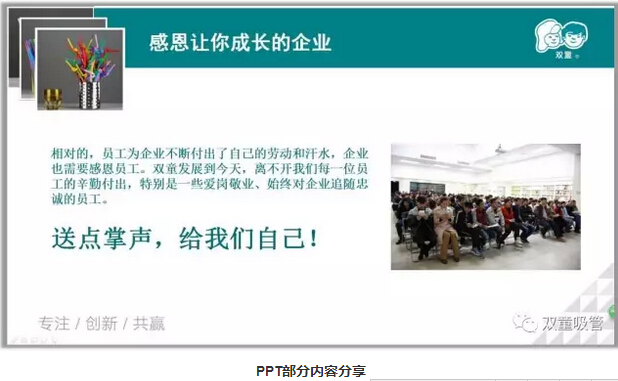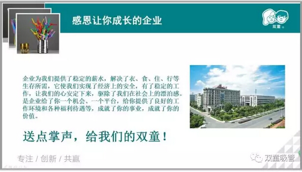 接下來,吸管妞進(jìn)行了“實(shí)踐感恩之心”的主題分享,企業(yè)為我們提供了穩(wěn)定的薪水,解決了衣、食、住、行等生存所需,它使我們實(shí)現(xiàn)了經(jīng)濟(jì)上的安全,有了穩(wěn)定的工作,給我們提供了平臺(tái)和機(jī)會(huì)……說到這里,童鞋們的掌聲紛紛響起,感謝“雙童”,讓我們成長!