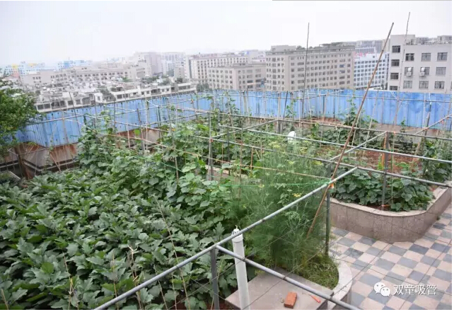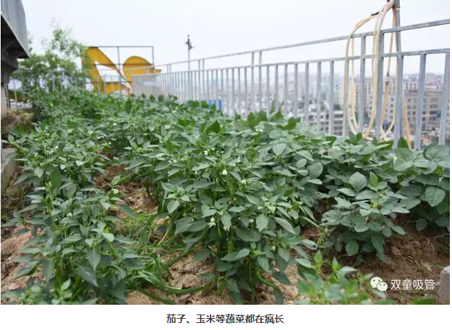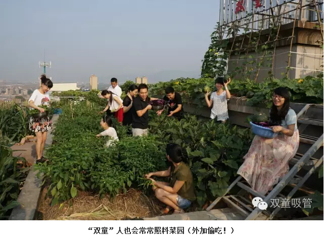 很多忙碌的上班族都?jí)粝胱约河卸€閑田,田里有各式新鮮的蔬菜水果,綠油油的一片美好,早晨起來吹吹晨風(fēng),摘點(diǎn)果子閑步漫游,好不愜意!在“雙童”就有這么一個(gè)神奇的存在——屋頂菜園。