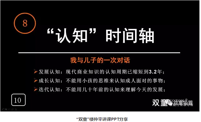 接下來,“雙童”樓仲平也和大家分享了《“利他”經(jīng)營的商業(yè)邏輯》,引導創(chuàng)業(yè)者要從改變認知開始實現(xiàn)思維轉(zhuǎn)變,下面吸管妞就和大家分享幾點“雙童”樓仲平對大家的建議吧!