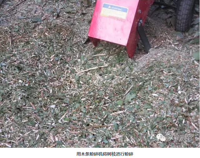 而對園林綠化維護中產生的樹枝枯葉等生物質垃圾,我們則專門購置了一臺木條粉碎機,對生物質垃圾進行粉碎處理。該物四四方方,遍體通紅,上一口,側一口,塞進去的枝葉全都絞碎成粉末,威力可真是大!