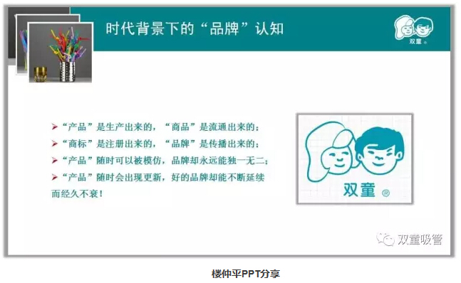 原來,“雙童”品牌的核心——一男一女的商標圖案在最初時,幾乎全國的吸管廠都在用,產(chǎn)品、包裝、規(guī)格都一樣,只是廠家信息不同。這個現(xiàn)象讓樓仲平很好奇,他就拿著這個圖案找義烏工商局咨詢,義烏工商局的科長直截了當?shù)母嬖V他,這一定是已經(jīng)注冊過的商標了!但是樓仲平并不死心,花了三百塊錢查詢費要求科長在電腦上查一下,經(jīng)過查證之后發(fā)現(xiàn)這個商標還真沒有人注冊,陳科長通知樓仲平:“你要注冊的話帶齊相關證件,自己過來注冊”。最后,樓仲平搶占了先機,用了2000元把這個圖案注冊為商標,在和妻子商議之后,確定了“雙童”作為商標的名字,兩個兒童一男一女,比較容易記憶。就是這樣,“撿來”了“雙童”的商標,也邁出了企業(yè)的品牌建設和發(fā)展最為關鍵的一步!