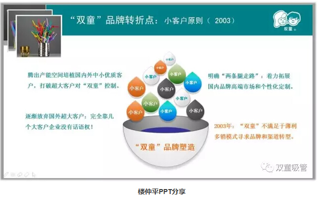 第三階段:差異化呈現(xiàn)階段。很多人會很好奇,“雙童”作為一家吸管制造企業(yè),為什么會吸引大量的社會和媒體關注呢?當家人樓總和大家坦白:其實,這就是我們一直以來塑造差異化亮點,并做到“人無我有,人有我先”,用“講故事”的形式把“雙童”品牌傳播到大江南北的結果!當然,這之前有一個前提:一定要先把企業(yè)做好!