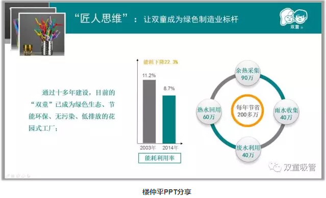 最后,樓仲平也分享道:其實(shí)真正把自己的產(chǎn)品做好了,企業(yè)在一定時(shí)候擴(kuò)大規(guī)模才是自然而至的,因此不要一味地想著大,要學(xué)會(huì)適當(dāng)做減法。“雙童”的發(fā)展始終伴隨著不斷的放棄,在自己的領(lǐng)域里細(xì)分細(xì)分再細(xì)分,把一根吸管做到極致!
