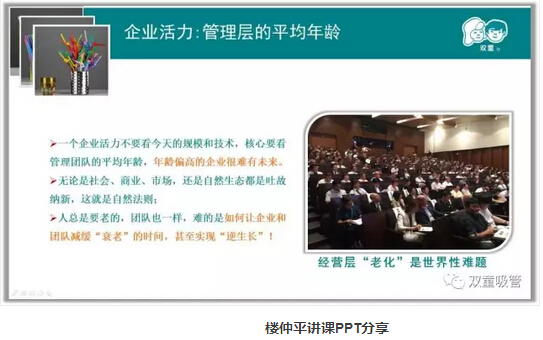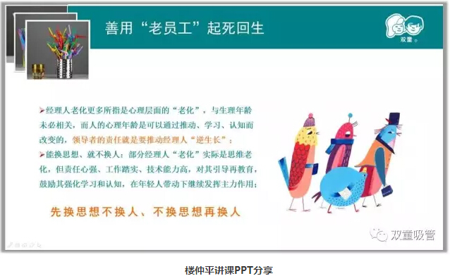 通過(guò)樓仲平個(gè)人的迭代,也促進(jìn)了“雙童”團(tuán)隊(duì)的蛻變,推動(dòng)團(tuán)隊(duì)向年輕化、知識(shí)化和信息化轉(zhuǎn)變。2011年9月,“雙童”發(fā)布了第二個(gè)《企業(yè)五年發(fā)展規(guī)劃》,明確“再造經(jīng)理人”計(jì)劃,明確領(lǐng)導(dǎo)層更替:選拔培養(yǎng)年輕領(lǐng)導(dǎo)層、重要崗位領(lǐng)導(dǎo)年輕化、明確實(shí)施股份制改革,慢慢解決管理層老化問(wèn)題!重組后的“雙童”團(tuán)隊(duì)平均年齡不到三十歲,大部分核心團(tuán)隊(duì)的工齡在十年以上,學(xué)歷、知識(shí)層次和忠誠(chéng)度大幅提高!