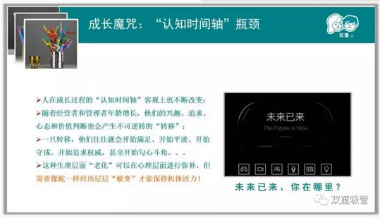 其實(shí),經(jīng)理人老化更多所指是心理層面的“老化”,而人的心理年齡是可以通過(guò)推動(dòng)、學(xué)習(xí)、認(rèn)知而改變的,而領(lǐng)導(dǎo)者的責(zé)任就是要推動(dòng)經(jīng)理人“逆生長(zhǎng)”。“雙童”在每周一和周三的19-21點(diǎn),舉辦全體員工的學(xué)習(xí)會(huì),確保所有員工每月有累計(jì)8小時(shí)的學(xué)習(xí)和培訓(xùn);將員工的學(xué)習(xí)與職業(yè)升遷掛鉤,讓每個(gè)員工不斷學(xué)習(xí)和認(rèn)知到新事物。