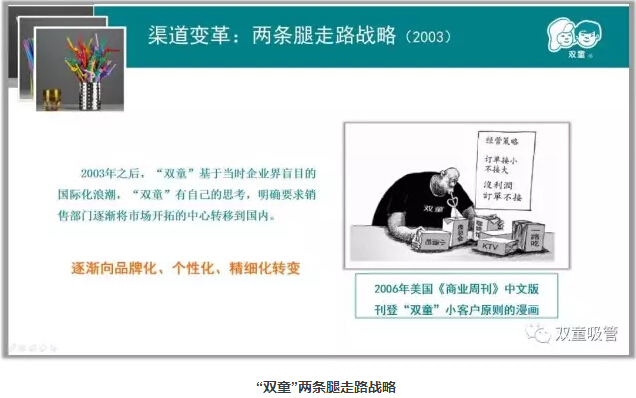 現(xiàn)在,“雙童”的小客戶達到了12000多家,這些寶貴的客戶客觀上與企業(yè)一直發(fā)生著貿(mào)易關(guān)系。正是因為訂單額不大,對產(chǎn)品有個性化要求,反而造就了很高的品牌黏性,通過訂單的積累,長期為企業(yè)創(chuàng)造著價值。通過實施“小客戶原則”和“兩條腿走路”戰(zhàn)略,“雙童”在客戶數(shù)量提高的同時風險大大下降,從而抓住了企業(yè)的主動權(quán),帶動品牌的提升!