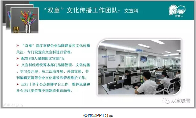 “左邊是閃亮點(diǎn)的傳播介紹,包括了綠色制造、節(jié)能降耗、精細(xì)化管理以及技術(shù)創(chuàng)新等內(nèi)容。右邊通過微博、微信、博客、官網(wǎng)、百科等制造話題,即時(shí)發(fā)布博文、軟文、帖子等內(nèi)容,并進(jìn)行互聯(lián)網(wǎng)、IT推廣、展位推廣等自媒體的傳播。上邊則是政府、媒體關(guān)注的價(jià)值觀傳播。三大部分組成了‘雙童’的文化傳播樹!”
