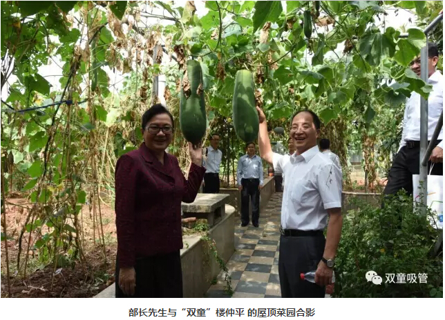 在交流過程中,有陪同領導談到了“雙童”的屋頂菜園,部長先生一聽也非常感興趣,雖然時間已經(jīng)超時,但部長先生表示想要去看看。原先,考慮到外部高溫天氣,樓仲平本沒有安排參觀屋頂菜園,既然部長先生如此感興趣,“雙童”樓仲平也陪同部長先生來到了九樓的屋頂菜園,門一打開,當看到滿園的瓜果蔬菜時,大家都興奮極了!看到碩大的冬瓜時,部長先生更是高興的不得了,還邀請樓仲平一起合影呢!她說道:“我真是太喜歡‘雙童’了!