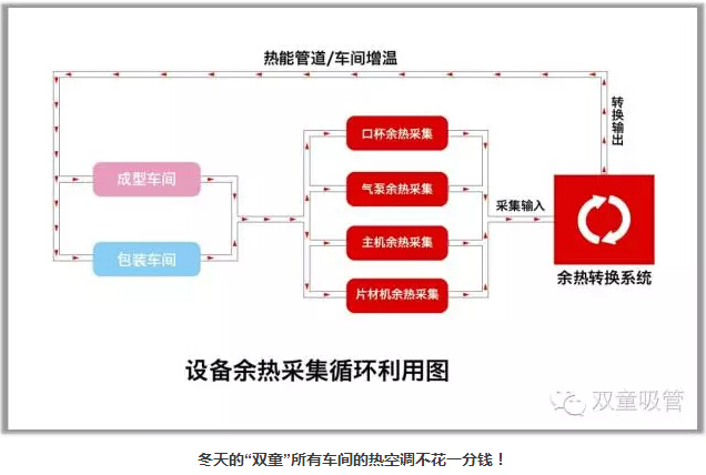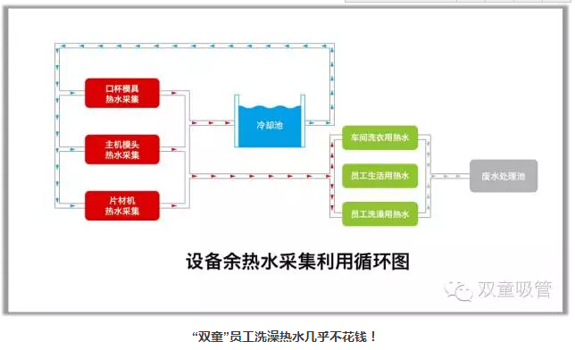 設(shè)備余熱水循環(huán)系統(tǒng)及設(shè)備余熱采集系統(tǒng)的投入:2005年,“雙童”對(duì)所有經(jīng)過模具的50度溫水進(jìn)行收集,處理之后供應(yīng)到所有寢室衛(wèi)生間給員工洗澡洗衣生活之用。同時(shí),“雙童”也引進(jìn)日本技術(shù)對(duì)所有生產(chǎn)設(shè)備的余熱和廢氣進(jìn)行采集并回收,再通過空調(diào)管道輸送到需要加溫的各個(gè)車間和工段。通過上述方式,“雙童”光是在余熱水采集和設(shè)備余熱采集方面,每年就節(jié)省了150多萬元,消滅了企業(yè)產(chǎn)生的污染和排放!