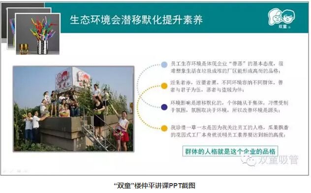 另一方面,環(huán)境對(duì)人的影響是潛移默化的,個(gè)體隨從于集體,習(xí)慣受制于氛圍,氛圍取決于環(huán)境。“雙童”鳥語花香的生態(tài)環(huán)境,其目的不僅僅在于“善心”和“愛心”,也是為了促使員工思想意識(shí)的轉(zhuǎn)變,讓員工養(yǎng)成良好的行為習(xí)慣,促使企業(yè)精細(xì)化管理水平的提高。員工的習(xí)慣好了,思想轉(zhuǎn)變了,才能用“心”生產(chǎn)出更好的產(chǎn)品!各位粉絲們,你們覺得呢?