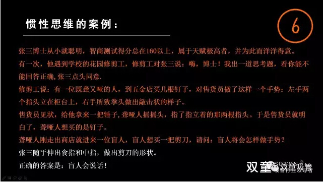 樓仲平通過“盲人買剪刀”及“吵架”兩個(gè)小案例和大家分享了認(rèn)知“慣性思維”:“我們常常會(huì)局限于既有的信息或認(rèn)識(shí)的積累,習(xí)慣于從固有的角度來觀察、思考事物。這種思維一旦形成就很難打破,并習(xí)慣性拒絕接受新事物,久而久之形成固有的思維模式!所以,很多時(shí)候限制自己的恰恰是自己的思維定式,我們要跳出自己的思維定式!”