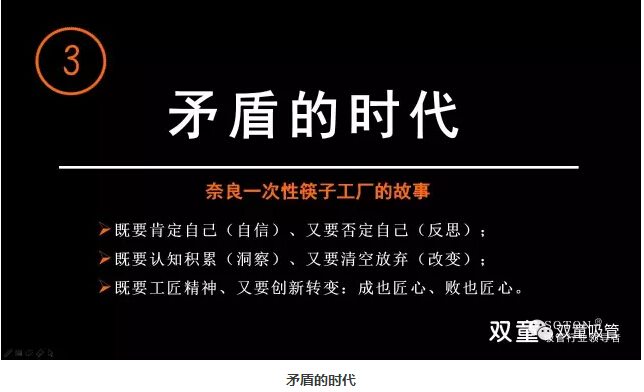 “雙童”樓仲平通過日本奈良一次性筷子的故事告訴大家成也工匠精神、敗也工匠精神,沒有改變,“工匠”精神也沒有用。作為創(chuàng)業(yè)者來講,我們不能用過往的經(jīng)驗(yàn)來理解發(fā)生的一切,否則你會(huì)被時(shí)代所拋棄。在不同的時(shí)代,你對(duì)時(shí)間和技術(shù)進(jìn)步的理解是不一樣的,既要肯定自己、又要否定自己;既要認(rèn)知積累、又要清空放棄;既要工匠精神、又要?jiǎng)?chuàng)新轉(zhuǎn)變!