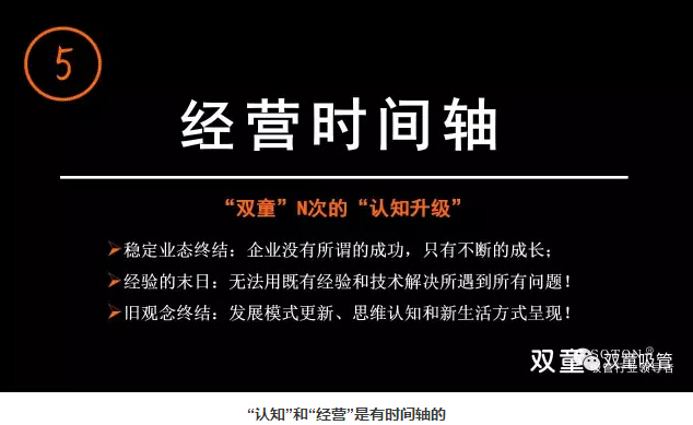 樓仲平也用“雙童”的發(fā)展史告訴大家經(jīng)營(yíng)也是有時(shí)間軸的,會(huì)遇到各種瓶頸和每個(gè)階段的“天花板”。企業(yè)沒有所謂的成功,只有不斷的成長(zhǎng),我們無法用既有經(jīng)驗(yàn)和技術(shù)解決所遇到所有問題!