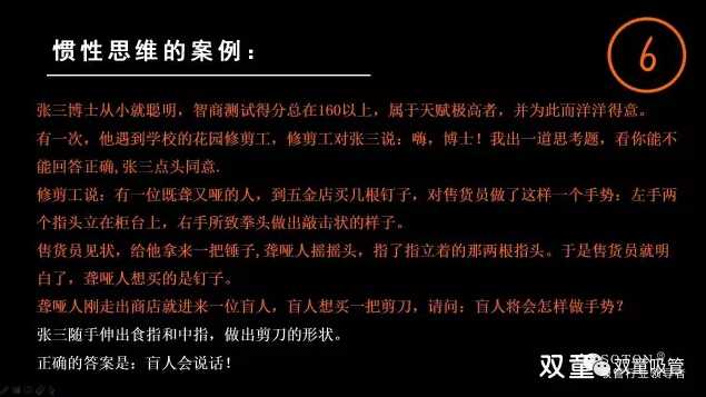 樓仲平通過“盲人買剪刀”及“吵架”兩個(gè)小案例和大家分享了認(rèn)知“慣性思維”:“我們常常會(huì)局限于既有的信息或認(rèn)識(shí)的積累,習(xí)慣于從固有的角度來觀察、思考事物。這種思維一旦形成就很難打破,并習(xí)慣性拒絕接受新事物,久而久之形成固有的思維模式!所以,很多時(shí)候限制自己的恰恰是自己的思維定式,我們要跳出自己的思維定式!”
