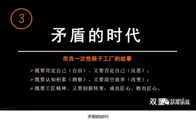 “雙童”樓仲平通過日本奈良一次性筷子的故事告訴大家成也工匠精神、敗也工匠精神,沒有改變,“工匠”精神也沒有用。作為創(chuàng)業(yè)者來講,我們不能用過往的經(jīng)驗(yàn)來理解發(fā)生的一切,否則你會(huì)被時(shí)代所拋棄。在不同的時(shí)代,你對(duì)時(shí)間和技術(shù)進(jìn)步的理解是不一樣的,既要肯定自己、又要否定自己;既要認(rèn)知積累、又要清空放棄;既要工匠精神、又要?jiǎng)?chuàng)新轉(zhuǎn)變!